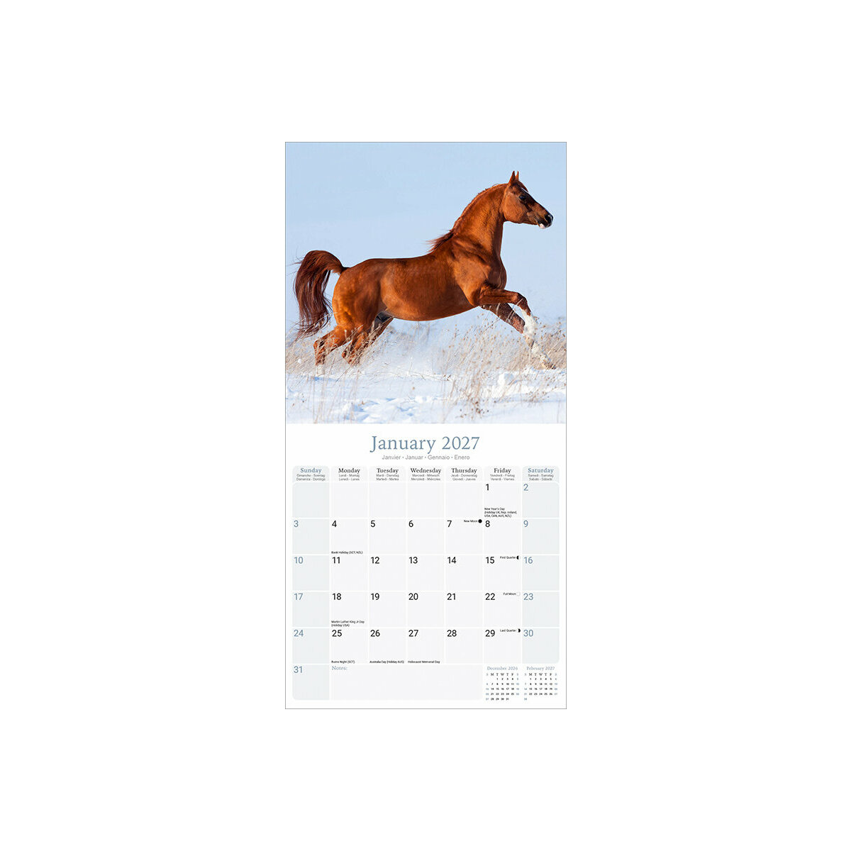 Le Calendrier 2027 Chevaux Arabes mesurant 30x30cm fermé et 30x60cm ouvert, offre un équilibre parfait entre esthétique et fonctionnalité. Chaque mois présente une moitié dédiée à une photo inspirante, tandis que l'autre moitié est réservée aux éphémérides, offrant une organisation pratique pour toute l'année.
