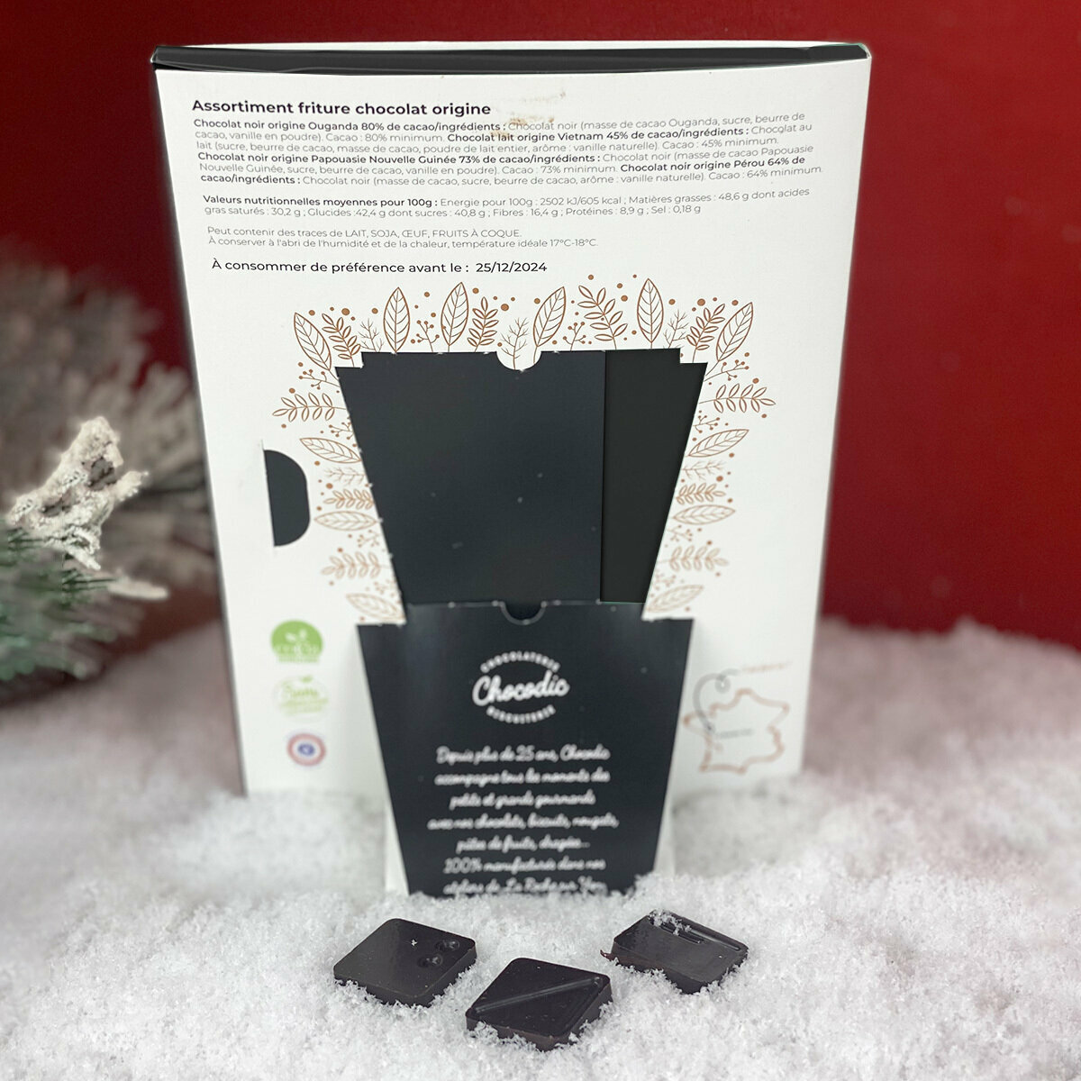 Pour attendre Noël, dégustez chaque jour un chocolat parmi un assortiment de carré de chocolat noir 73% de cacao, lait 33% de cacao et blanc 31% de cacao ! Savourez un chocolat fabriqué de manière artisanale !