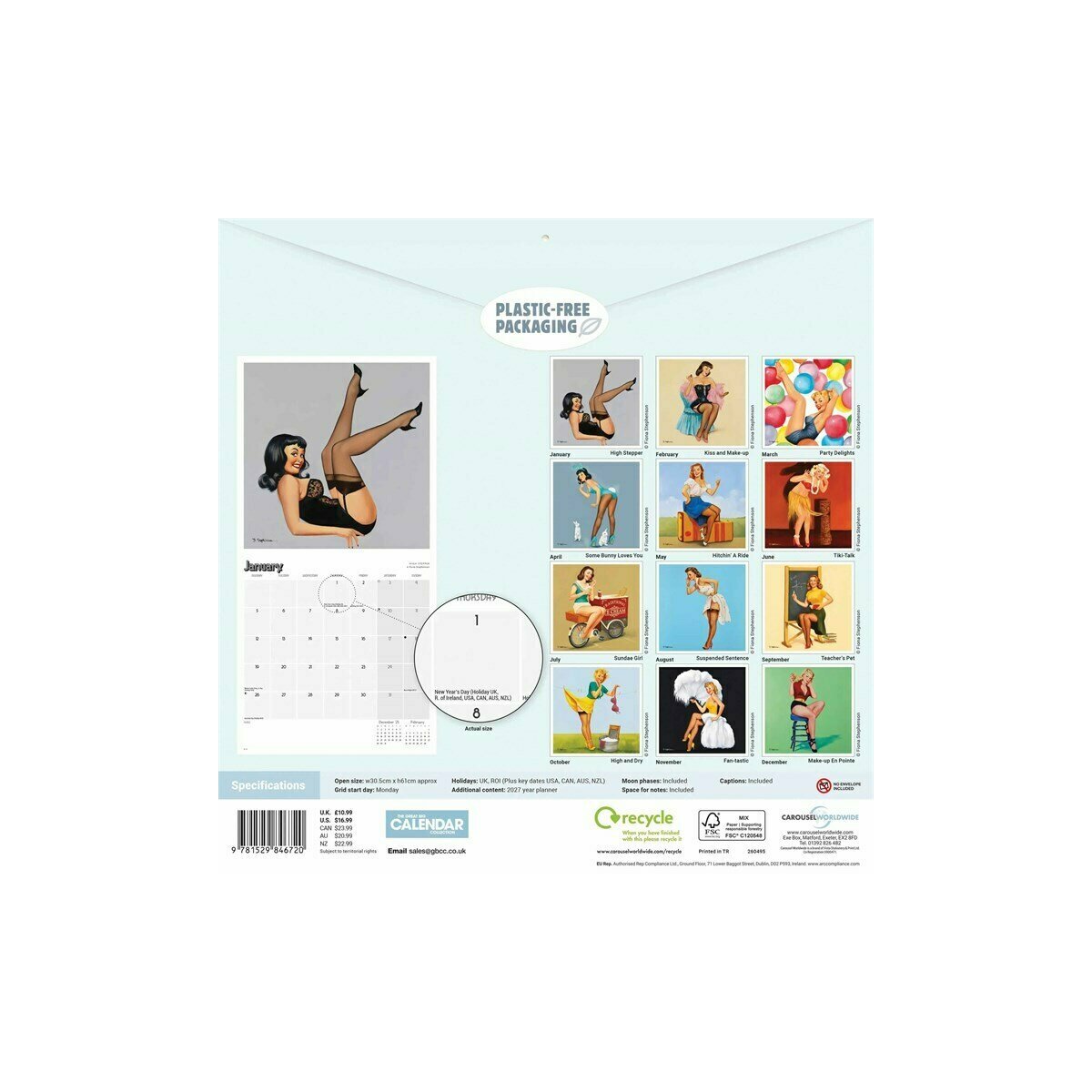 Illustrées avec finesse, ces figures féminines emblématiques évoquent à la fois charme, humour et sophistication d’une époque révolue. Le calendrier est 100 % sans plastique, respectueux de l’environnement, tout en étant parfaitement protégé pour préserver la qualité des images. La partie supérieure (30x30 cm) met en valeur le dessin, tandis que la partie inférieure (30x30 cm) contient une éphéméride spacieuse.