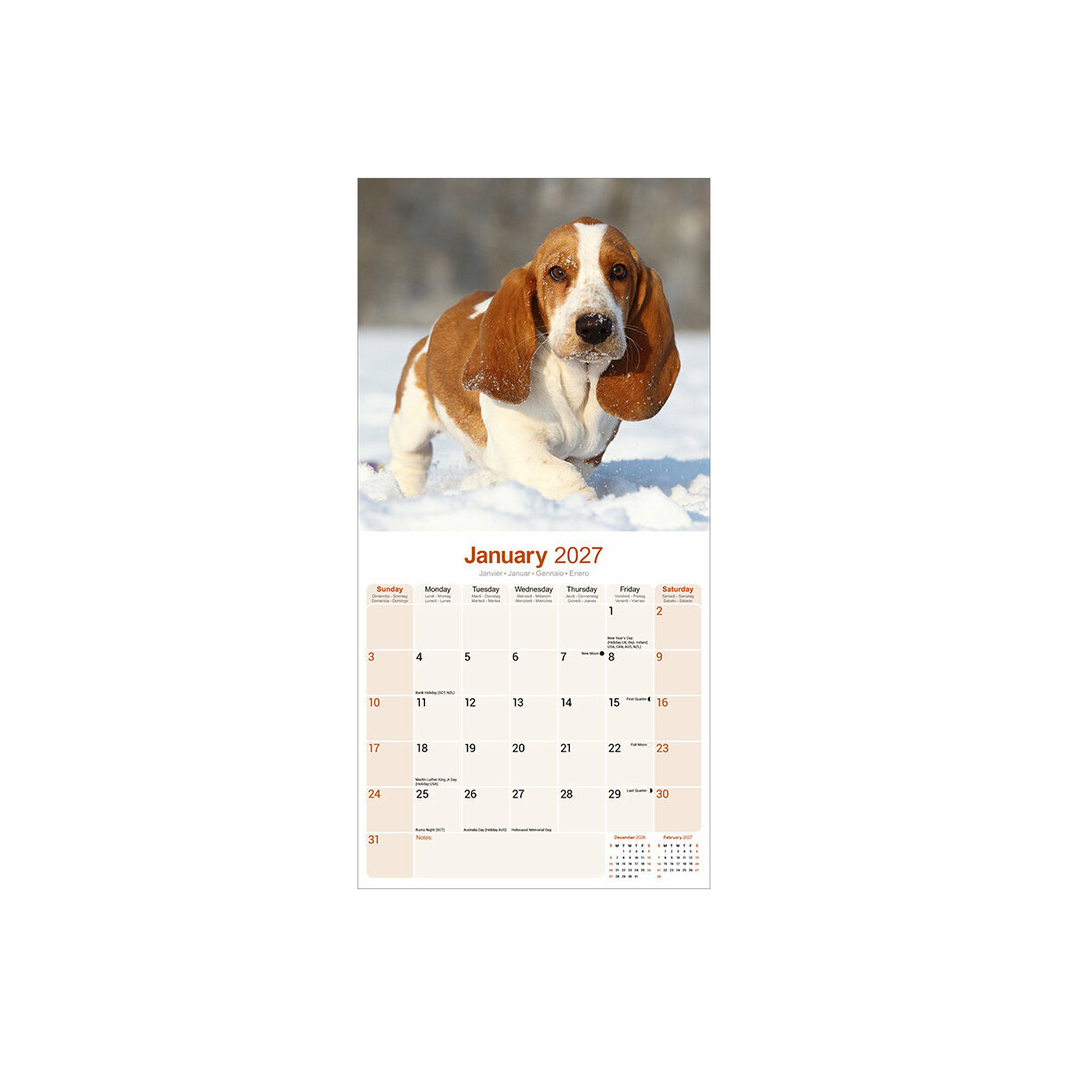 Le Calendrier 2027 Basset présente chaque mois une nouvelle photo de Basset Hound capturant leur charme décontracté, leurs expressions faciales adorables et leur personnalité attachante. Chaque image met en valeur la beauté unique de cette race, offrant une année pleine de moments de tendresse et de joie pour les amoureux des chiens.
