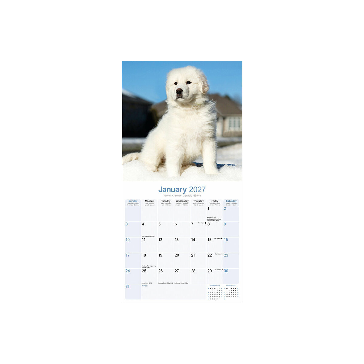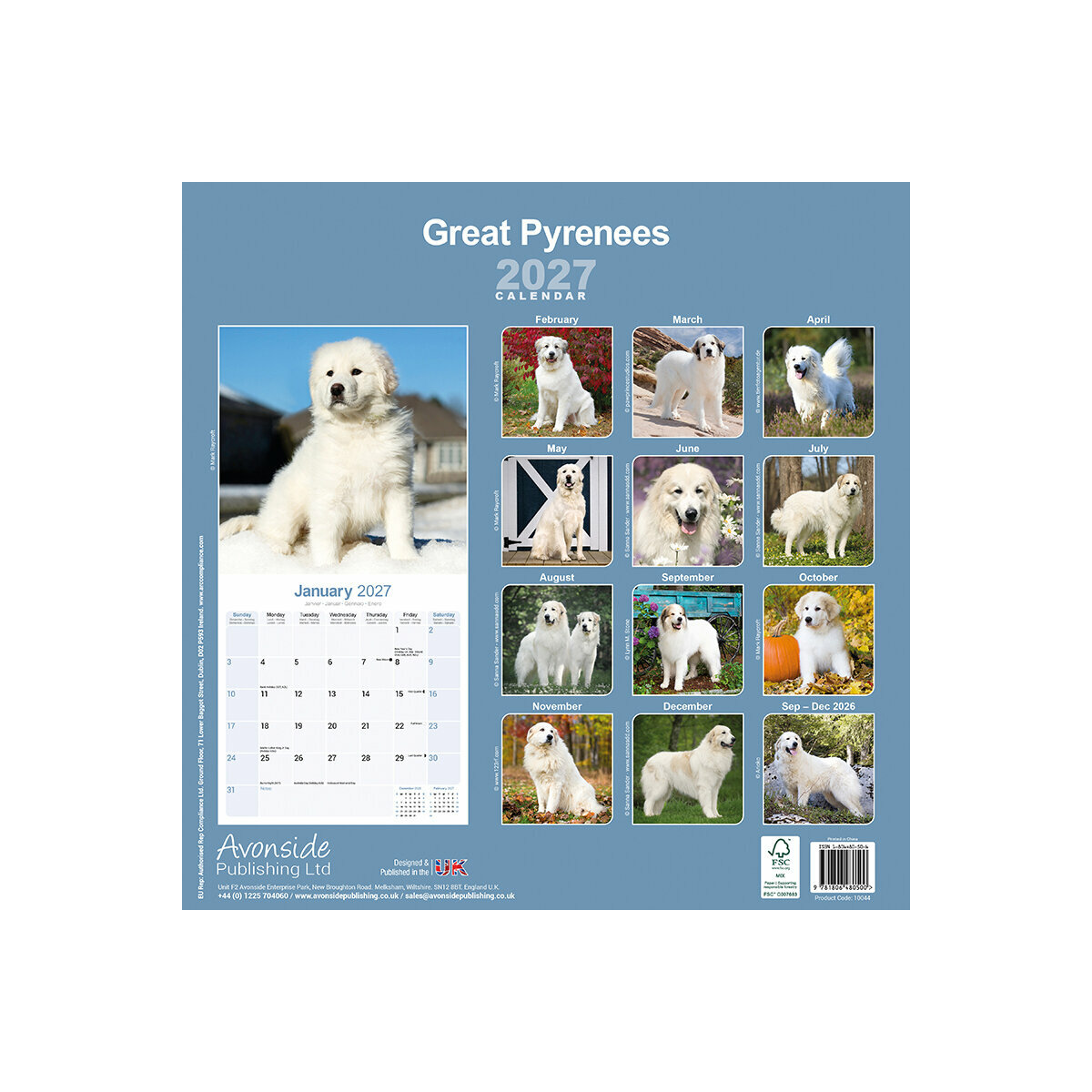 Découvrez le Calendrier 2027 Montagne des Pyrénées, majestueux et puissant, est un chien de grande taille et de nature douce. Avec son pelage épais et sa loyauté inébranlable, il est un compagnon protecteur et aimant, bien adapté à la vie de famille et à la garde du bétail dans les régions montagneuses.