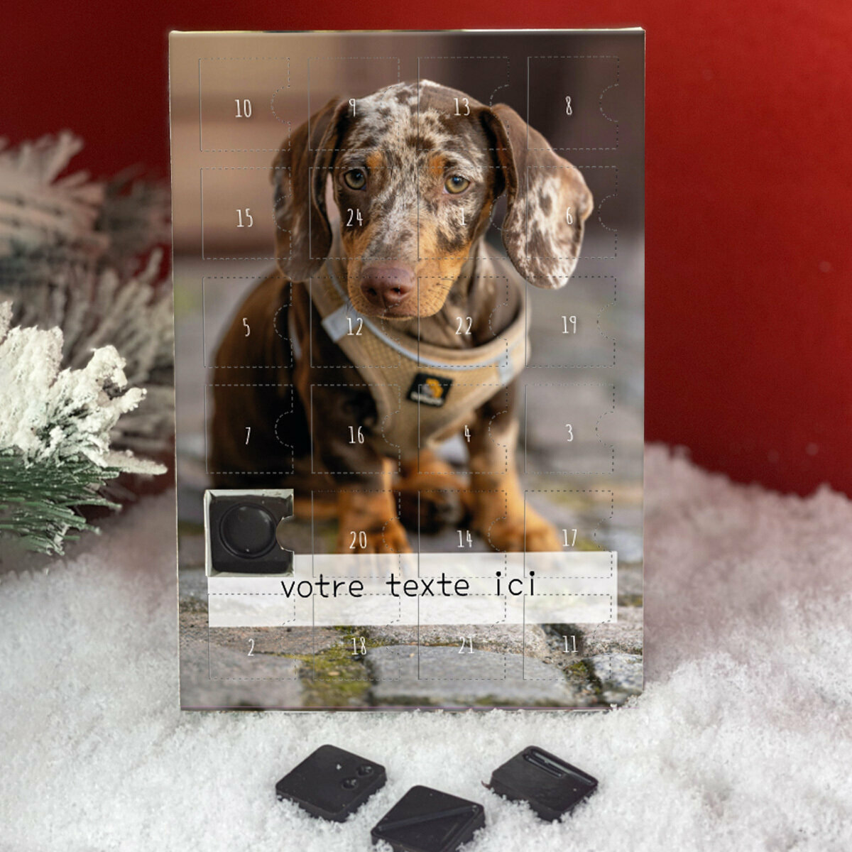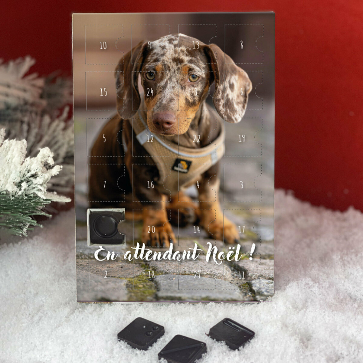 Plus de détail : Calendrier de l'avent Teckel Poil Lisse Arlequin personnalisé avec votre message