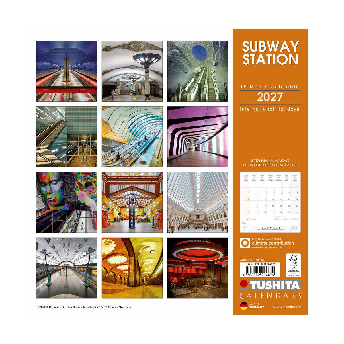 Ce calendrier mural en papier au format 30x60 cm explore l’architecture des stations de métro iconiques. Chaque mois, une photo spectaculaire met en avant des stations renommées, de leurs mosaïques artistiques à leurs structures modernes. Un hommage visuel aux designs uniques des métros du monde entier, parfait pour les amateurs d’architecture urbaine.