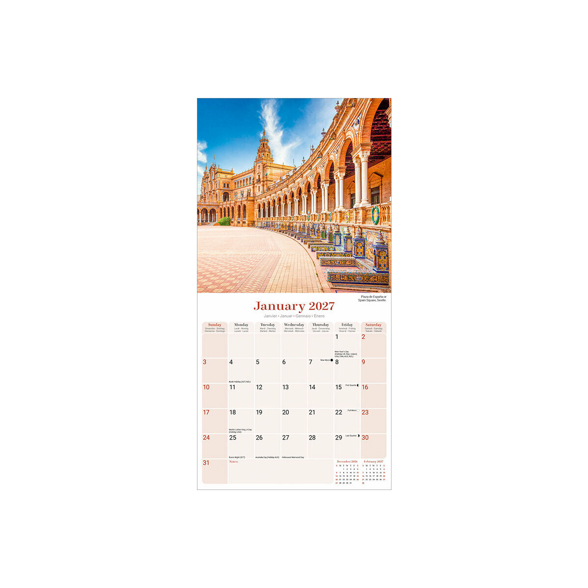 Le Calendrier 2027 Espagne célèbre l'Espagne à travers ses sites emblématiques. Chaque mois révèle une nouvelle image des lieux les plus importants, tels que la Sagrada Familia de Barcelone, l'Alhambra de Grenade et la Plaza Mayor de Madrid, offrant une immersion visuelle dans la richesse culturelle et historique de l'Espagne.