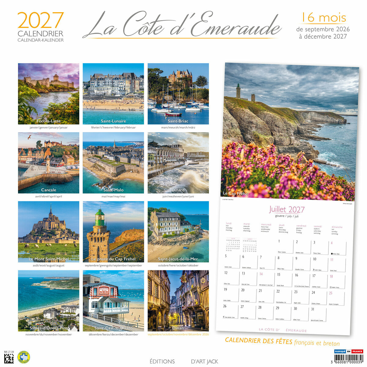 Ce Calendrier 2027 Côte d'Emeraude sur 16 mois (de Septembre 2026 à décembre 2027 ) est illustré de magnifiques photos