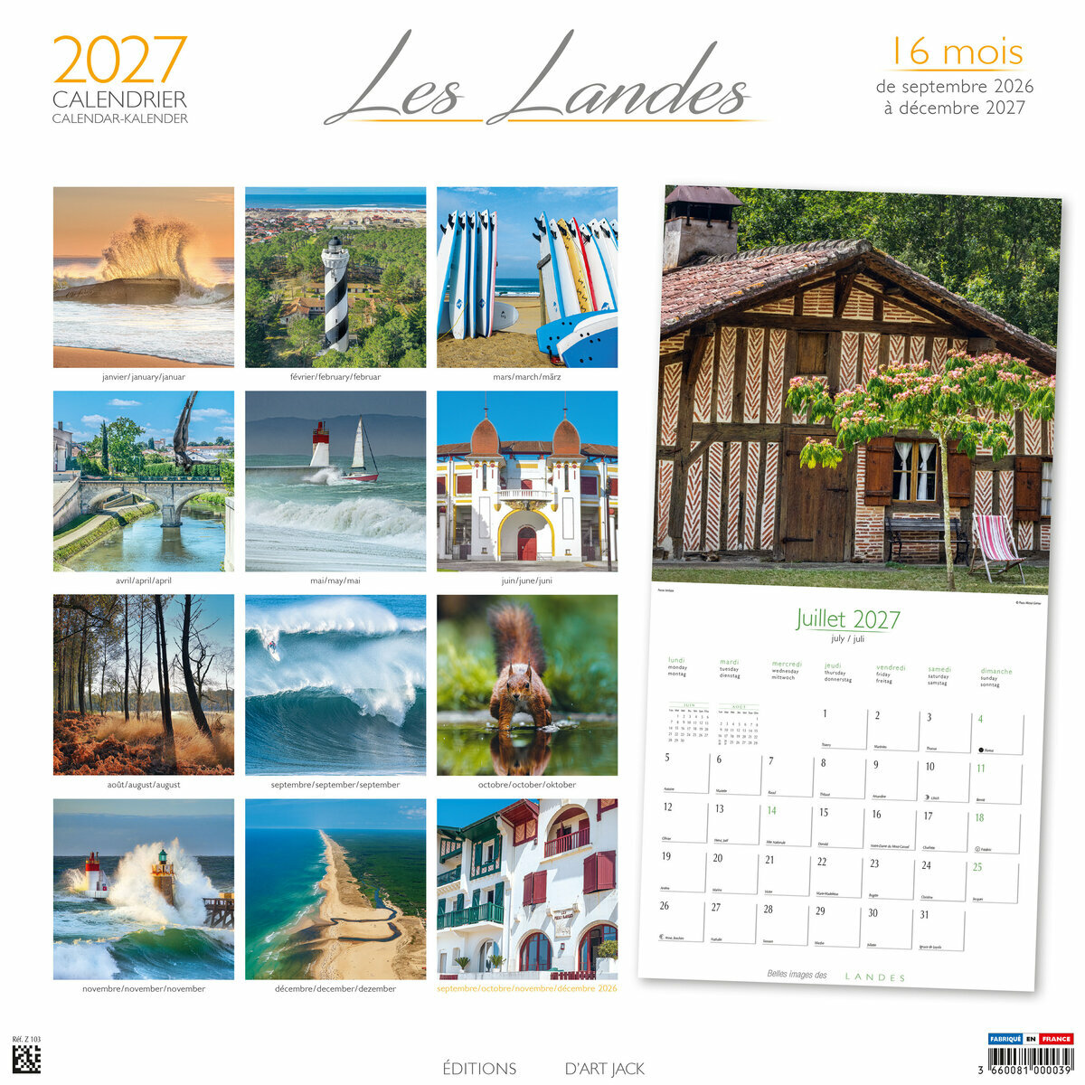 Ce Calendrier 2027 Les Landes Plage sur 16 mois (de Septembre 2026 à décembre 2027) est illustré de magnifiques photos