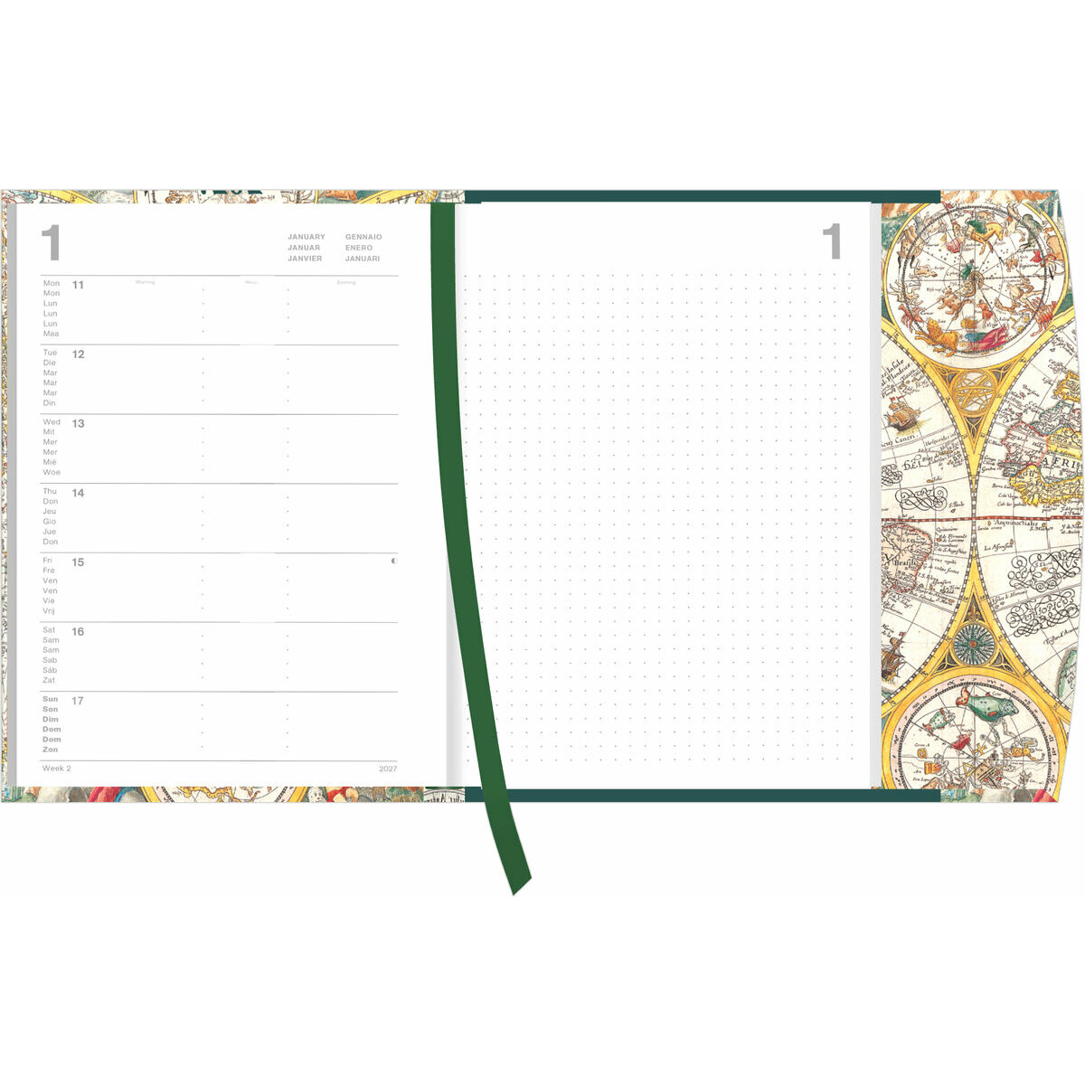 Un Agenda 2027 avec des couvertures rigides ornées de cartes géographiques antiques offre une fusion unique entre le passé et le présent. Chaque couverture présente une carte richement détaillée, évoquant l'aventure et la découverte. À l'intérieur, l'organisation moderne rencontre le charme rétro, offrant une expérience d'exploration et de planification captivante.